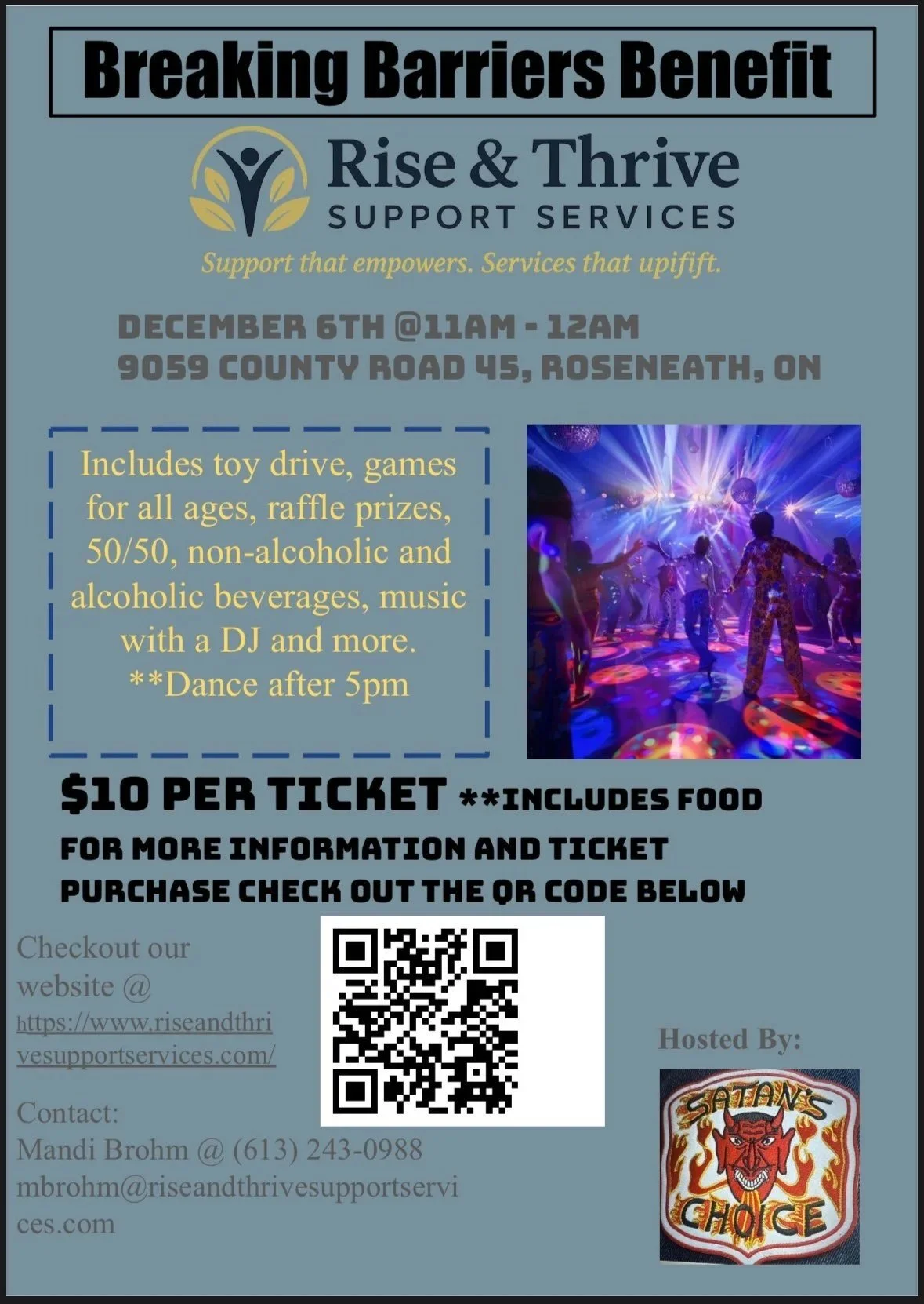 The Benefit Fundraiser supports Rise and Thrive’s mission to strengthen the services we provide to people living with mental health challenges, addiction, and dual diagnosis. Funds raised will go directly toward expanding our peer and community-based programs, increasing access to practical day-to-day supports, and creating more opportunities for recovery-focused connection, stability, and hope. Every contribution helps us meet people where they are, reduce barriers to care, and ensure more individuals and families can access compassionate, wraparound support when they need it most.